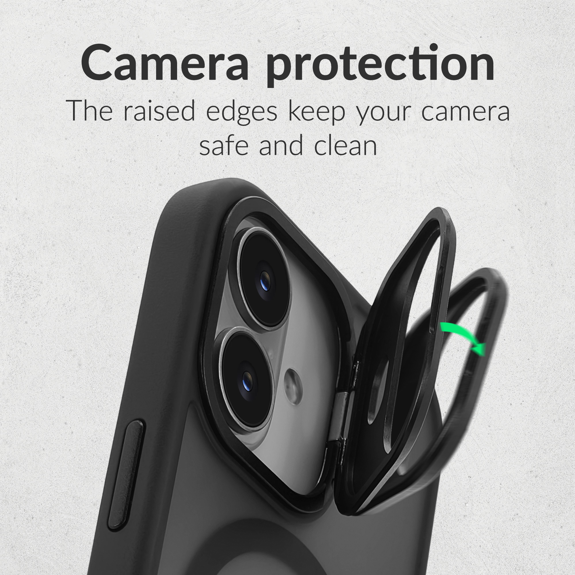 Een ingebouwde camerastandaard maakt het mogelijk om je iPhone stabiel neer te zetten voor video-opnamen of handsfree gebruik. De verhoogde randen rond het scherm en de camera bieden extra bescherming tegen krassen en vuil. De metalen knoppen zorgen voor een premium look en een verfijnde drukrespons.