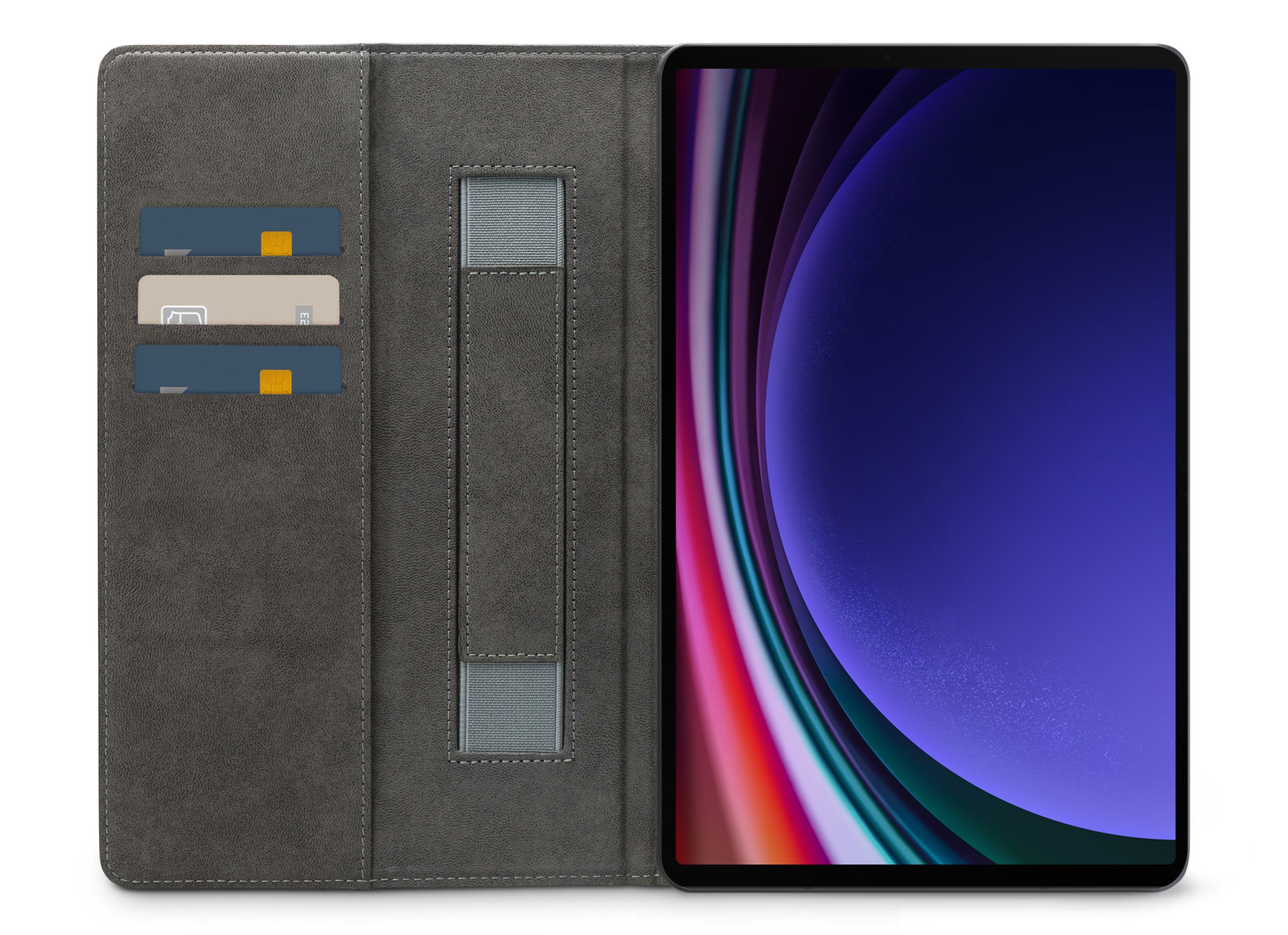 Aan de linker binnenkant van de case zitten drie vakjes voor pasjes, briefgeld en/of visitekaartjes. De case beschikt over een stand functie, zodat je hem makkelijk neer kunt zetten om bijvoorbeeld Netflix of foto’s te kijken. Ook heeft hij aan de linker binnenkant een band waar je hand doorheen kan steken zodat je jouw tablet goed vast kan houden.