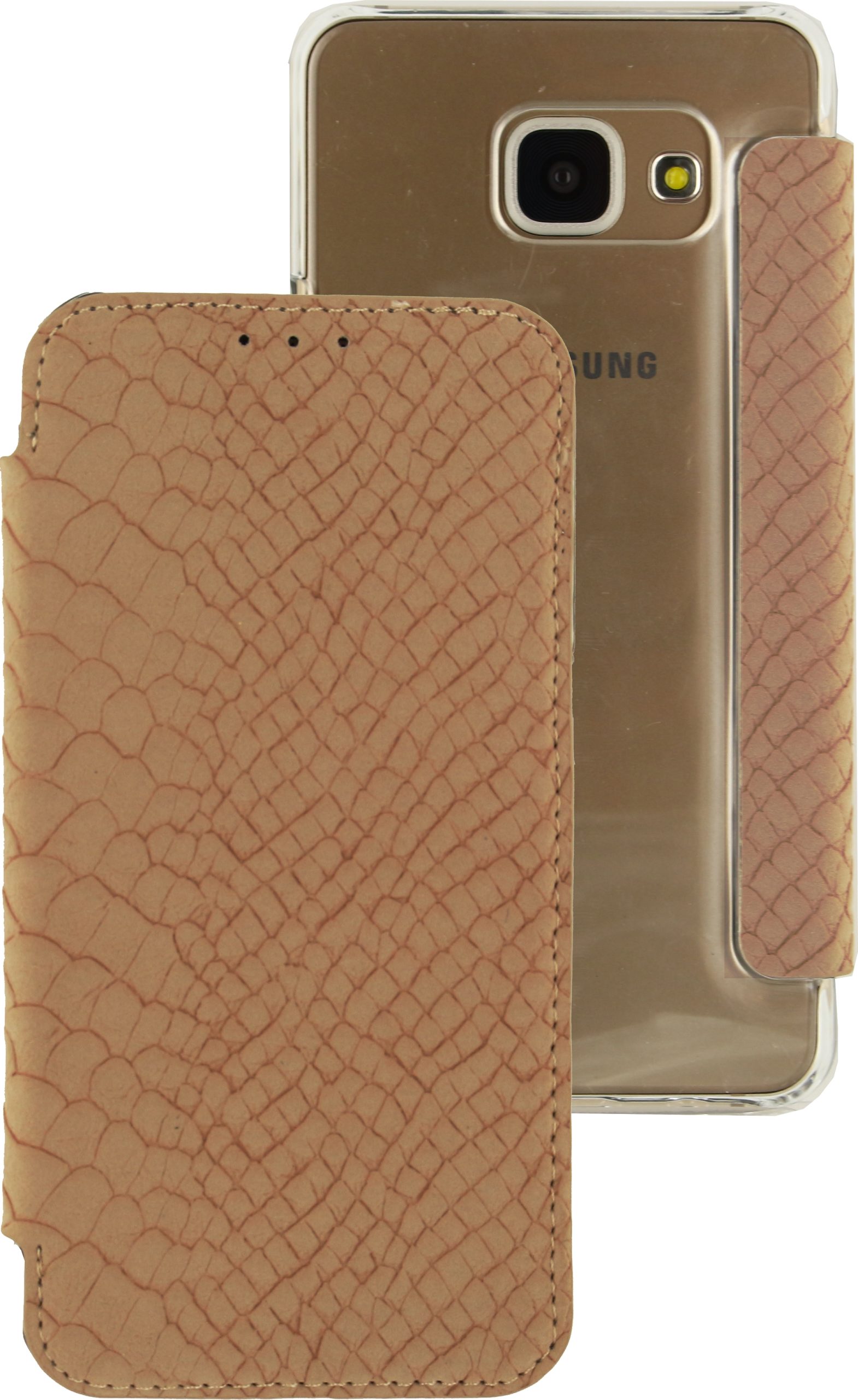 Met de Slim Booklet serie heeft u wel een heel bijzondere case in handen. Dit product is namelijk een combinatie van een hardcover en een book case. De flap aan de voorkant is gemaakt van kunstleer en voorzien van een slangenleerprint. Het materiaal voelt prettig aan en is zacht als suède. Er is een uitsparing gemaakt voor de speaker. Aan de binnenkant zit microvezel, wat bijdraagt om uw beeldscherm vlek- en krasvrij te houden. Er is hier ruimte voor een pasje, visitekaartje of briefgeld. De flap is vastgemaakt aan een transparante hardcover. Zo zijn ook de achterkant en hoeken van uw telefoon beschermd tegen schade, maar dan op een minimalistische manier. Het originele design van telefoon blijft nog goed zichtbaar. Hierdoor is de case veel subtieler dan een gewone book case, maar biedt het wel dezelfde voordelen.