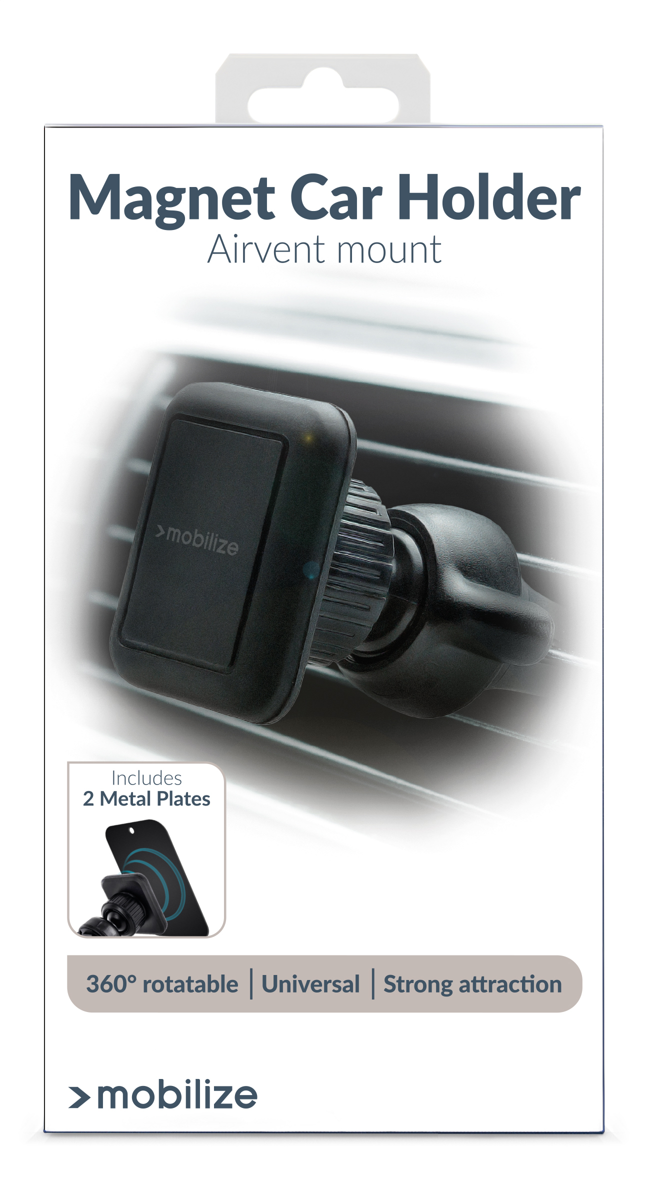 De Mobilize Universal Magnet Holder Air Vent is een kleine, onopvallende houder voor in uw auto. Hij is gemaakt van hard kunststof en voorzien van een rubberen laag. U kunt hem door middel van de klem eenvoudig bevestigen aan het luchtrooster van uw auto. Dit doet u door aan de ring te draaien, zodat de klem opent. Steek de houder in het luchtrooster en draai de ring weer dicht, zodat de klem stevig vastzit op het luchtrooster. U kunt de klem versmallen middels bijgeleverde stickers.