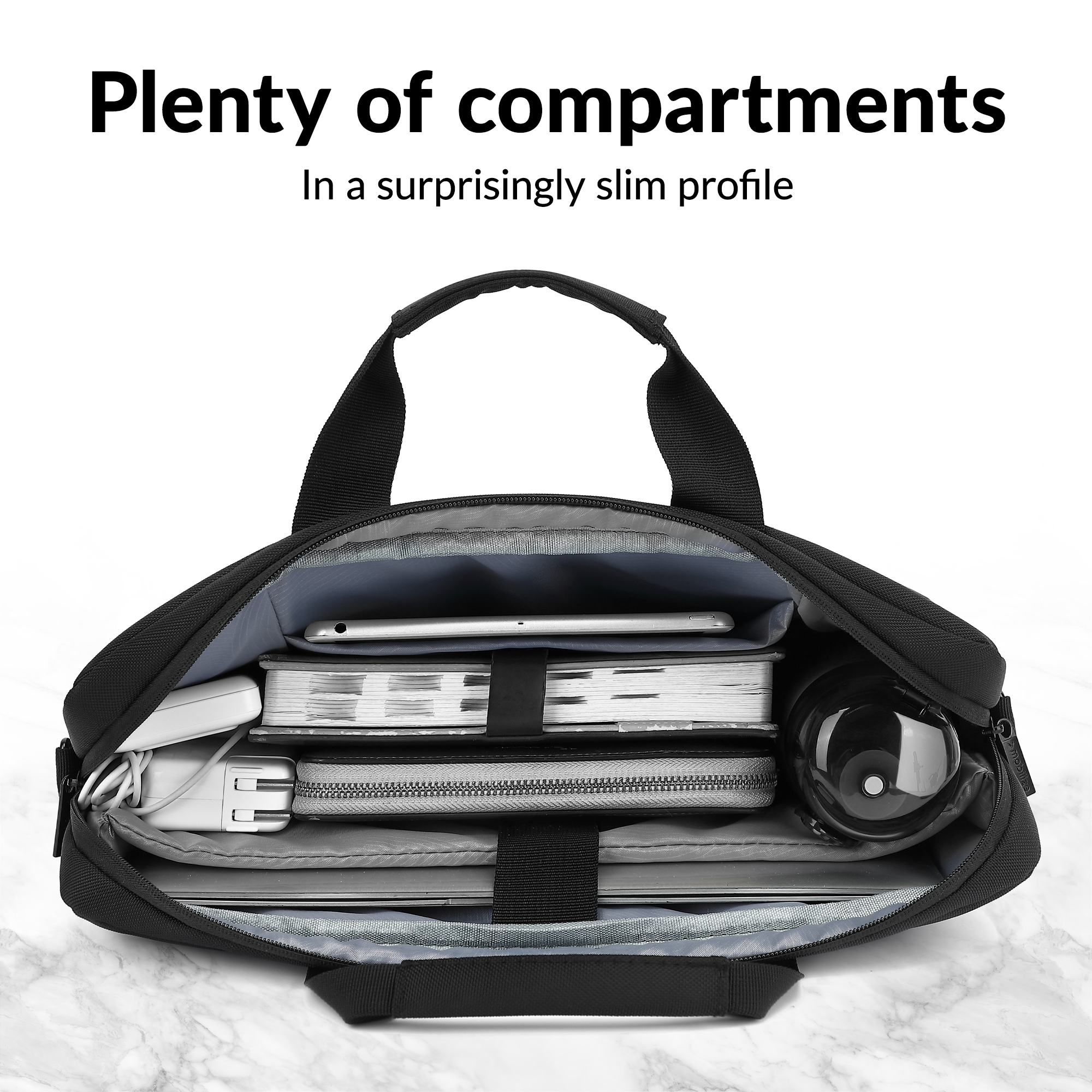 Het tweede vak biedt ook genoeg ruimte voor papieren of notities en heeft daarnaast drie kleinere zakjes, ideaal voor het opbergen van een muis, oplader of andere benodigdheden.