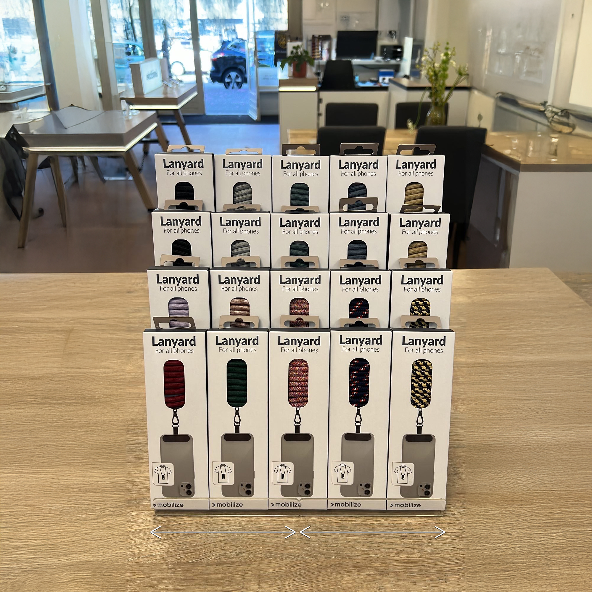 Hiervoor hebben we een transparante display ontwikkeld van acryl. Het display is breed inzetbaar voor diverse producten. Zo kan je er allerlei soorten producten in presenteren, bijvoorbeeld onze Mobilize cases, laders of lanyards.